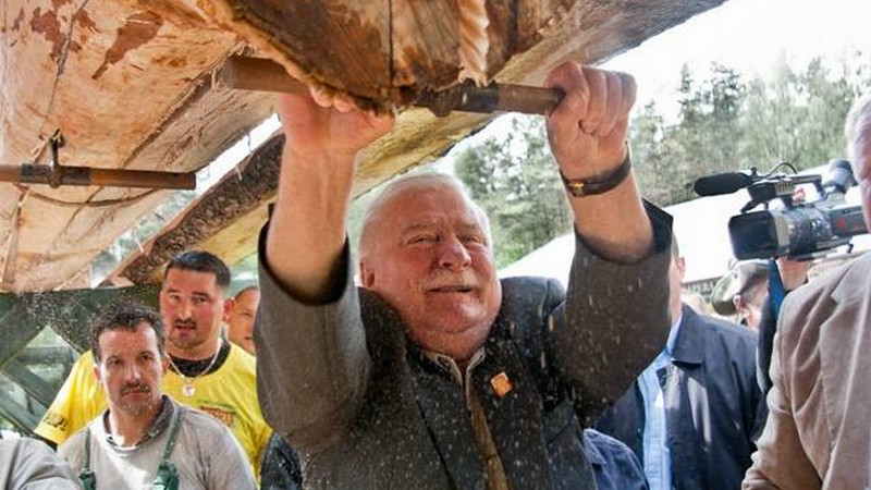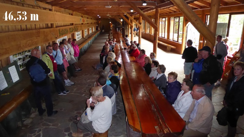 ♦La planche mesure 46,53 m ! Elle fait 8 cm d’épaisseur, 87 cm dans sa plus grande largeur et pèse 1100 kg ! Elle provient d’un sapin de Douglas abattu par les bûcherons dans la forêt de KolaÅska Huta, non loin du Centre. Transporté par voie d’eau puis par voie terrestre, l’arbre a ensuite été découpé, jour après jour, centimètre par centimètre, par des centaines de personnes (ouvriers de la scierie locale, pompiers, hommes politiques - dont Lech WaÅÄsa et son épouse qui vont donner les derniers coups de scie le 2 juin 2012), avec des scies de deux mètres de long devant être maniées par deux personnes, des scies permettant des coupes précises et ne risquant pas de briser le bois jusqu'à l’ultime instant de la découpe. Tous ceux qui ont participé au transport et à la coupe de l’arbre l’ont fait de façon bénévole.